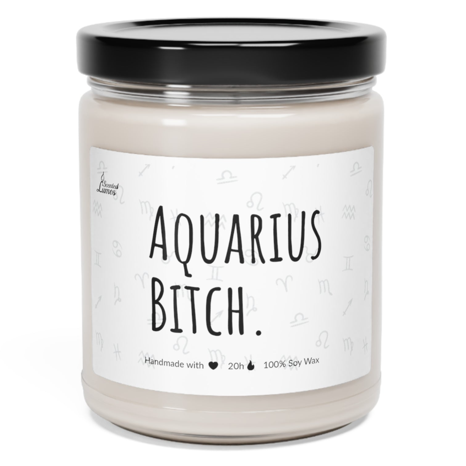 a jar of aquarius bitch candle sitting on a white surface