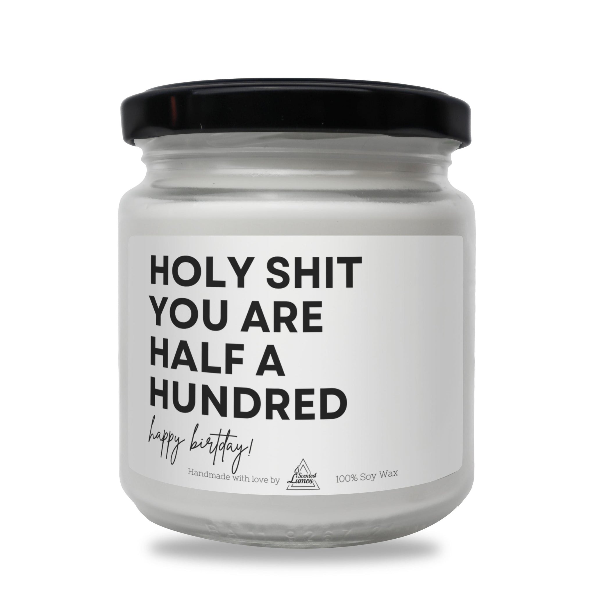 Introducing a unique candle, gift for friends, family, colleagues, with a cool design: Holy shit you're half a hundred perfect for celebrating a 50th Birthday.